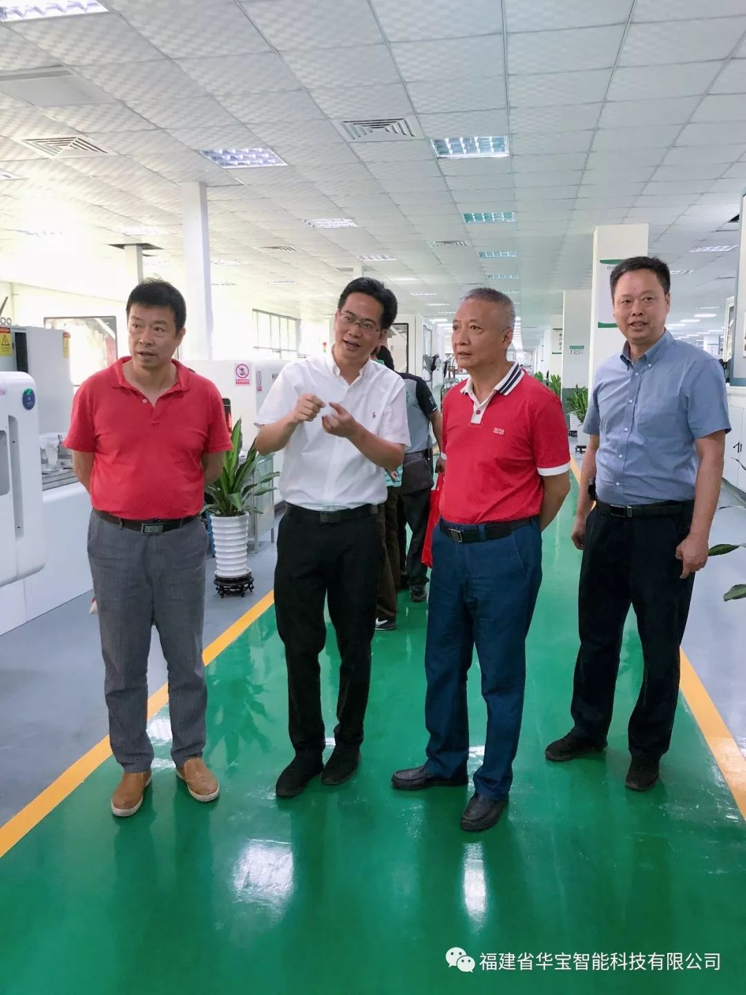 福建華閩集團劉平山董事長、王志明副董事長、池徳庭常務(wù)副總、張靚董事長助理、林玉明業(yè)務(wù)部經(jīng)理、技術(shù)人員張平山一行對華寶科技休閑鞋智能化成型生產(chǎn)線硫化工藝產(chǎn)線以及冷粘工藝產(chǎn)線進行參觀,同時也對華寶科技致力于鞋業(yè)的自動化控制和鞋業(yè)機械的相關(guān)產(chǎn)品的研 發(fā)、生產(chǎn)和銷售表示支持與肯定!